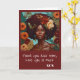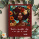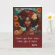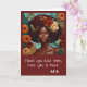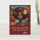 Unikt Morsdagskort med en vacker kvinnas ansikte på brun bakgrund. Hon har orange blommor i sitt afro och bohoörhängen. På framsidan ser du textutrymmet där du kan redigera egna namn eller den text du föredrar .."älskar dig, etc..) Detta kan du enkelt ändra.