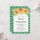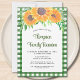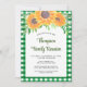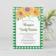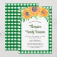 Bjud in din familj till deras sammandkomst med denna blomsterinbjudan till familjeåterträff som är dekorerad med akvarellsolfjäll och lövverk på en grön gingham-bakgrund.