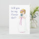 En inbjudningskorta med en liten flicka i brudtärnas dräkt blygt lukta på blomsterbuketten, från en akvarellmålning av Judy Adamson. Inbjudan på framsidan är 'Vill du vara min blomsterflicka?' och baksidan är tom för att du ska kunna skriva din egen hälsning.