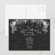 Detta är ett vackert rustikt bröllopsfest-kort med en svart bräda, några uppsättningar silverglittrande strängljus och en akvarell lila Wisteria