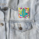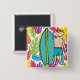 En blond surfare-pojke med blå surfbräda omgiven av tropiska växter av olika ljusa färger på en knapp som matchar våra Blond Surfer Boy-inbjudningar, porto frimärke och klistermärken!