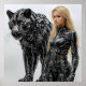 Blond kvinna i svart latexkostym som står bredvid en svart panter