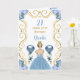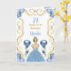 Den här inbjudan till födelsedagskort innehåller en elegant guld ram, en vacker prinsessa med blondinskt hår och en dammig blå klänning, blommor och ballong.