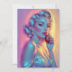 Illustrationen visar en glamourös pin-up-flicka med platinablont hår stiliserat i voluminösa, retroinspirerade vågor, mot en livfull gradientbakgrund i rosa, lila och orange nyanser. Hon bär en elegant, avskuldrat turkos klänning med delikat spetsdetalj längs halslinningen, som utstrålar vintage charm. Prydd med gnistrande pärljuveler, inklusive en flerskiktig chocker, dinglande örhängen och en armband, håller hon ett chokladägg i handen, vilket tillför en lekfull påskstämning. Den övergripande stilen påminner om klassisk pin-up-konst, med en modern, färgrik twist som framhäver hennes självsäkra och förföriska uppträdande.