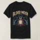 : En slående digital illustration med högkontrast som visar en vampyrliknande figur med ljusröd ögon och vassa flänsar, med ett lysande hörn. Bakgrunden visar en scen för skräpgravar med obart träd och gravsten under mörken himmel, där ord "BLOOD MÅNE" visas på en framträdande plats ovanför figur. Bilden användor en begränsad färg-palett med blåsor, lila och mot svart bakgrund, och skapar en dramatisk och ren atmosfär.
