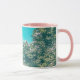 Ett mugg som har en fotografi av en enorm blomstrande lilak shrub och blå himmel.