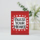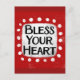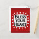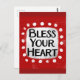 "Bless Your Heart" är en söt textdesign i rött med svart text, tillsammans med en vit accent-form och vita texturerade vita prickar runt den.