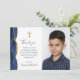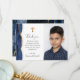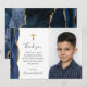 Tack vare det här kortet från den moderna första kommissionen i elegant finns en blå vattenfärgsagat gräns som trimmas med faux guld glitter. En liten guld faux foil kor visas över ord "Tack" i ett grått-handskriftsskript med kol mot vit bakgrund. Redigera texten med ditt personliga meddelande, lägg till barnets namn i handskriftsskript och byt enkelt ut exempelbilden mot ett foto av ditt barn. Kortets baksida har en matchande blå och guld-agate-design.