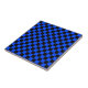 A blue and black checkerboard pattern fills the image, creating a uniform, alternating grid of squares, conveying a bold and geometric feel.