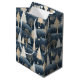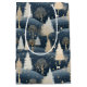 A lush winter pattern featuring deep blue fields topped with falling snow, cream deer silhouettes, and hearty cream winter pine trees dotting the landscape.