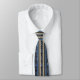 A damask pattern in shades of blue ornaments blue and gold stripes on this beautiful necktie. Resembles Victorian Gothic wallpaper in luxurious colors. Unusual design, still professional, and very elegant.