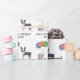 Utformning av matlagningsdagtid med Desteis ursprungliga tecknad illustration av en söt blå och vit jacka färg Boston Terrier-hund. Bredvid hund finns det färgstarka födelsedagsballonger som är bundna på ett hund ben och en lila och gult färg. Bakgrunden har en lekfull mönster av färglösa pastellkonfetti på vit bakgrund. Det finns också ett anpassningsbara textområde.