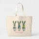 This Easter canvas tote bag features cute bunny rabbit green topiaries with pink, blue and yellow bows in blue and white chinoiserie flowerpots. Personalize the name on the front and holiday message on the back with your choice of special text.