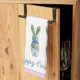 This personalized Easter kitchen dish towel features cute bunny rabbit green topiaries with pink, blue and yellow bows in blue and white chinoiserie flowerpots. Personalize the holiday message with your choice of special text. Perfect decor for your holiday party.