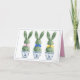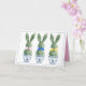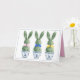 This Easter greeting card features cute bunny rabbits green topiaries with pink, blue and yellow bows in blue and white chinoiserie flowerpots. Personalize the holiday message on inside with your choice of special text.