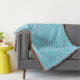 Blue and white diamond-patterned blanket shown horizontally and vertically with beige fringes. The design conveys a cozy, homey feel.