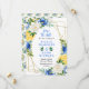 This beautiful and elegant save the date invitation features watercolor blue, yellow and white flowers with foliage on a gold geometric frame. The text combines handwritten script and serif fonts for a stylish and modern look. This is perfect for a spring or summer rustic wedding.