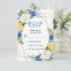 This fun and whimsical wedding rsvp enclosure card features watercolor blue, yellow and white flowers with foliage on a gold geometric frame. The text combines handwritten script and serif fonts for a stylish and modern look. This is perfect for a spring or summer rustic wedding.