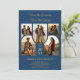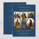 Stylish double graduation invitation with five arched photo placeholders and gold faux effect accents on blue background for two graduates