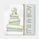 En magnet med en illustration av en babyduschkaka med ett blått, brunt och gräddfärgat färg-schema med matchande blått baby överst. Högernas sida är blå med brun trim. Brun text lyder: "Det är en pojke." Bakgrunden är rent blå polka dots. Underbar för en babyduschtjänst. Leta efter matchande inbjudningar och porto i Baby-kategorin i Jill's Paperie.