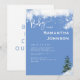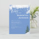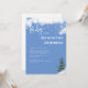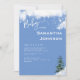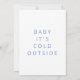 Bjukbildsinbjudan. Information på framsidan och baksidan. Snö. Winter träd. Baby är kallet utanför. Vit och blå bakgrund. Vit text.