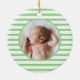 Elegant, modern och söt baby-fotojulprydnad på grönt rand mönster. Den här mallen innehåller en bra illustration av Blue baby dinosaur som sover under guld gultens stjärnor med anpassningsbar Baby namn. Vänd om du vill visa ett vackert foto från baby i den röda rand cirkeln ram. Underbar för både pojke och flicka. Perfekt för alla säsonger!