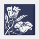En återgivning av en illustration av Aubrey Beardsley, omkring 1892. Bekvämt stiliserade poppies i vitt på blå bakgrund.
