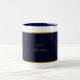 Drick din dryck i den vackra festliga guld-klockan träd mugg med blå bakgrund och säger God jul.