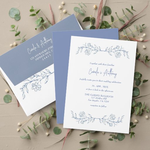 Blue Blommigt Boho Side Gräns Bröllop Inbjudningar