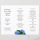 Trefaldigt bröllopsprogram med mörk grått-text och blå vattenblomskonstruktion. Fyll i tredjedelar efter köpet om du vill skapa tre sidor med rubrik, namn, datum och plats för service på framsidan. Första namnen av bruden och brudgummen står ut i söt blå, tryckt text. I avsnittet mitten finns information om ceremonin på högernas sida för att lista bröllopsfesten, anteckningar till gäster, minnesinformation eller vad du vill. Bright blåa blommor med grönt löv visas i grund på mittpanelen. Bakgrunden är vit och baksidan är helblå.