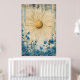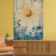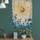The piece is characterized by its minimalist, bohemian aesthetic, featuring a radiant gold-textured sun with elongated rays set against a backdrop of delicate blue flowers and abstract, weathered textures.