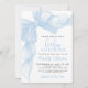 This cute blue bow baby shower invitation features a soft watercolor blue bow with flowing ribbons along the top and left edges for a sweet, playful look. The top of the invitation reads “Baby Shower” in a charming mix of script and serif fonts, setting a modern yet cute and elegant tone. The remaining details keep the design light, fun, and celebratory. Perfect for a boy baby shower, or gender neutral for a momma that likes blue.