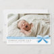 Blue Bow Modern Minimalist Script Baby Photo Birth Tack Kort