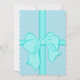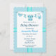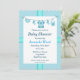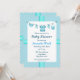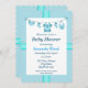 Blåbabyduschinbjudningar. På framsidan finns en blå bakgrund färg med ett mönster av mycket litet polka dots och ett ljusblått band som korsas över i mitten. Över bakgrunden är ett vitt rektangulärt utrymme för att lägga till all information. All text är lätt och mörk blått. Längst upp i rektangeln finns en tvättande linje med blå barnkläder som är kopplade till den. På baksidan finns en blå bakgrund med liten polka dots och ett korsat blått band med en stor blå båge i mitten.
