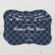 Simple, yet elegant blue buffalo plaid New Year card featuring string lights on a blue buffalo plaid background. Easily personalize online.