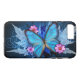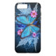 Ett telefonfodral med blå fjäril och rosa blommor, fjärilen har blå vingar med brunt kant, blommorna har rosa petals och gult centrum, bakgrunden är en mörk blått med vita löv och snurrar, och det finns också några blå stänk och punkter.