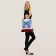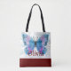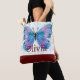 Anpassa den här vackra och generöst stora väskan med ditt namn eller annan önskad text. Den har en färgstark blå fjäril med burguddiga accenter på grund och texten ger en underbar kontrast.