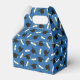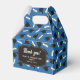 Graduation favor boxes printed with a blue pattern of graduation caps and diplomas with a yellow ribbon. Customize the graduation themed favor boxes with the name of the graduate or the name of the celebration, and with the date.