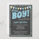 En kallbordsblått och gult barnduschinbjudan i funkyn med en schunkartad text "Det är en pojke!" överst med kritbordsbakgrund, flaggor och en söt polka-punkt-gräns.