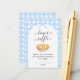 This charming diaper raffle enclosure card is designed as a coordinating insert to include with baby shower invitations. It features a cozy illustrated apple pie on a soft blue gingham background accented with delicate white floral details and a sweet coquette bow at the top. Elegant script typography highlights the title “Diaper Raffle,” while the clear message below encourages guests to bring a pack of diapers (any size) for a chance to win a prize. Perfect for pie-themed or bakery-inspired baby showers, this timeless pastel insert adds a fun and practical activity to your celebration and can be used for events held in any season.