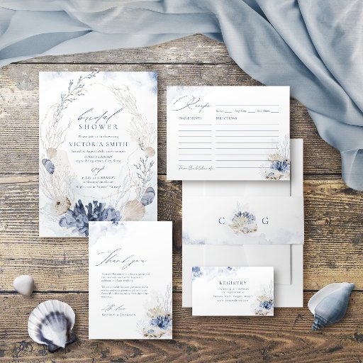 Elegant under the sea themed beach bridal shower arch invitation features dusty blue watercolor coral & seashells, stylish script and classy font event details, modern and romantic, great floral wedding bridal registry cards for sea themed summer beach wedding, winter tropical destination wedding, coastal ocean themed wedding.