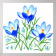 A print with three vibrant blue crocuses depicted with delicate green leaves. Their gentle petals and bright centers capture a fresh spring essence. Original artwork by W.B.