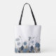 Elegant blommigt gräns-design med blå och beige blommor med långa stjälkar och löv på en vit bakgrund som skapar ett mjukt, modernt och sofistikerat utseende.