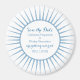 Sofistikerad och elegant Deco Retro Spara datum magneter i mörk blått med en cirkelformad dekretativ solsprängningsdesign. Enkel att anpassa, lägg bara till din bröllop-information i den text fält tillhandahåller. Klicka på Anpassa om du vill söka efter fler anpassningsalternativ.