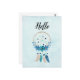 Ett vykort för hej med söt vattenfärgsdrömmare. Blå, turkos och grädde färg. Dekorerad med fjädrar, pärlor och blommor.