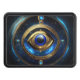 En royal blå iris med en stor svart elev sätts in i en guld öga-form omgiven av två koncentriska cirklar för att bilda en skyddande medaljon. Mindre cirklar i kardinalriktningarna innehåller ljusblå stenar som drar sin effekt från det galaktiska blåa stjärnområdet i bakgrunden.