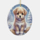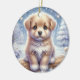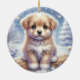 This endearing ornament showcases a fluffy puppy with soulful blue eyes, nestled on a snowy log beneath twinkling stars. Surrounded by frosty trees and glowing lights, it’s a magical tribute to innocence and holiday warmth.