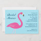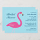 En söt rosa flamingo accentuerar den här stranden, inbjudningskort för möhippan på en ljus, blå bakgrund, skapar perfekten för sommartid, poolside, tropisk eller måltematisk dusch.