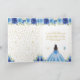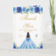 This elegant and glamorous birthday thank you card features a beautiful princess with dark hair and dark skin in a blue ball gown. The text combines handwritten script and modern sans serif fonts for a classy and sophisticated look. The floral arrangements, butterflies and gold confetti create the perfect blend of rustic and chic.