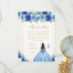 This elegant and glamorous birthday thank you card features a beautiful princess with dark hair and dark skin in a blue ball gown. The text combines handwritten script and modern sans serif fonts for a classy and sophisticated look. The floral arrangements, butterflies and gold confetti create the perfect blend of rustic and chic.